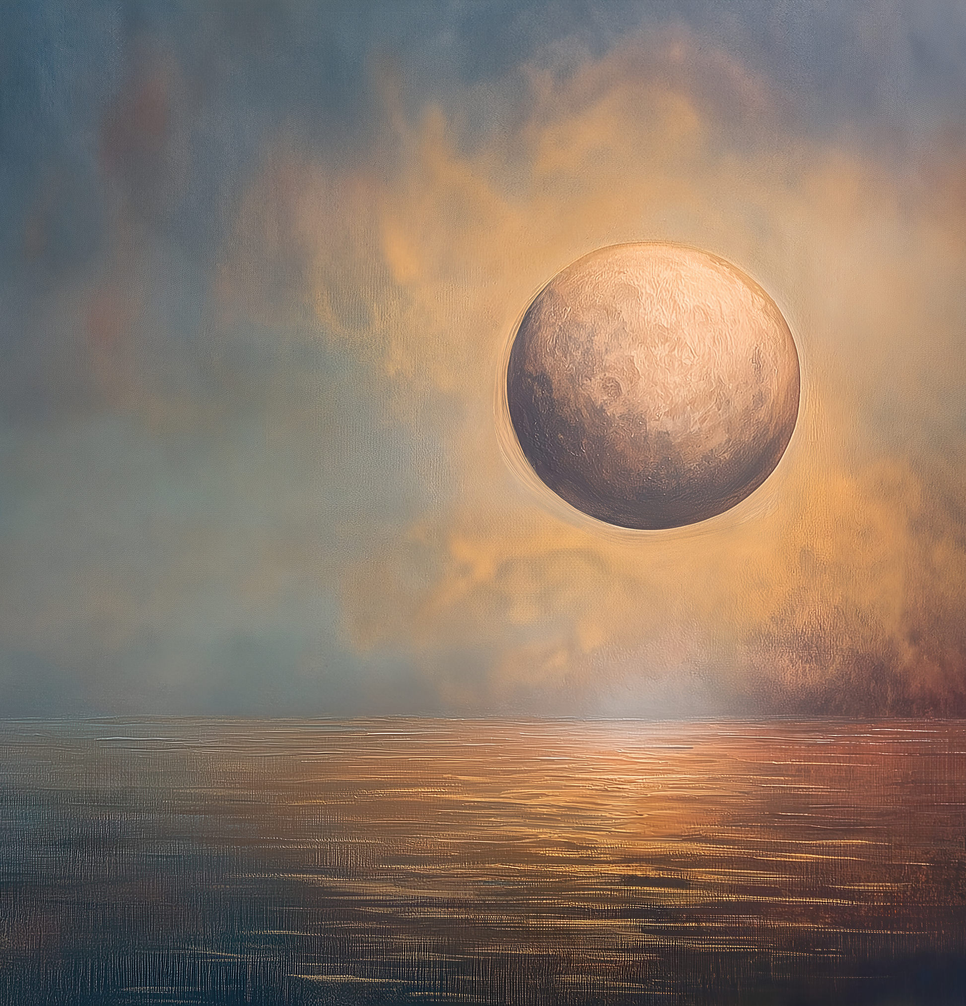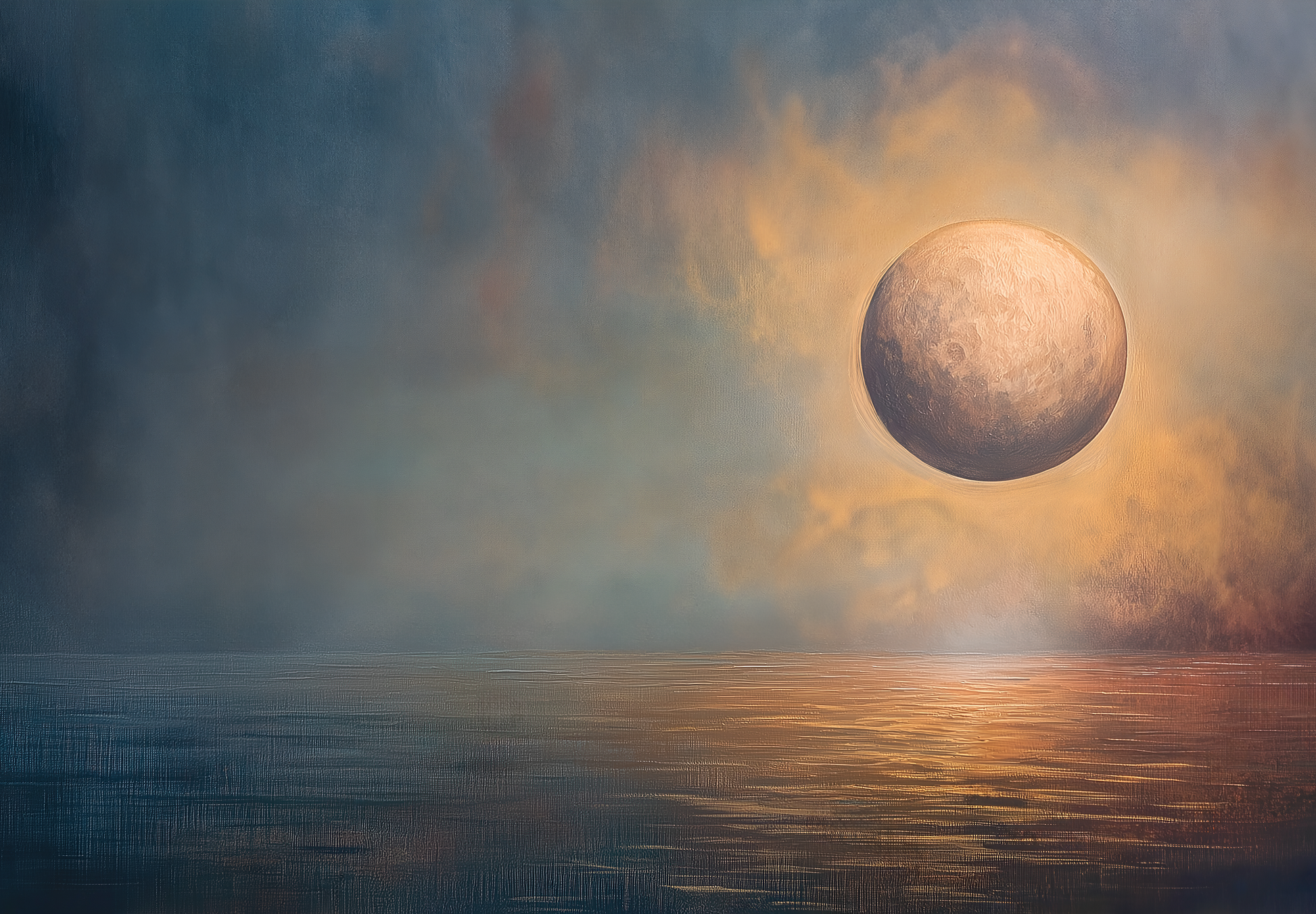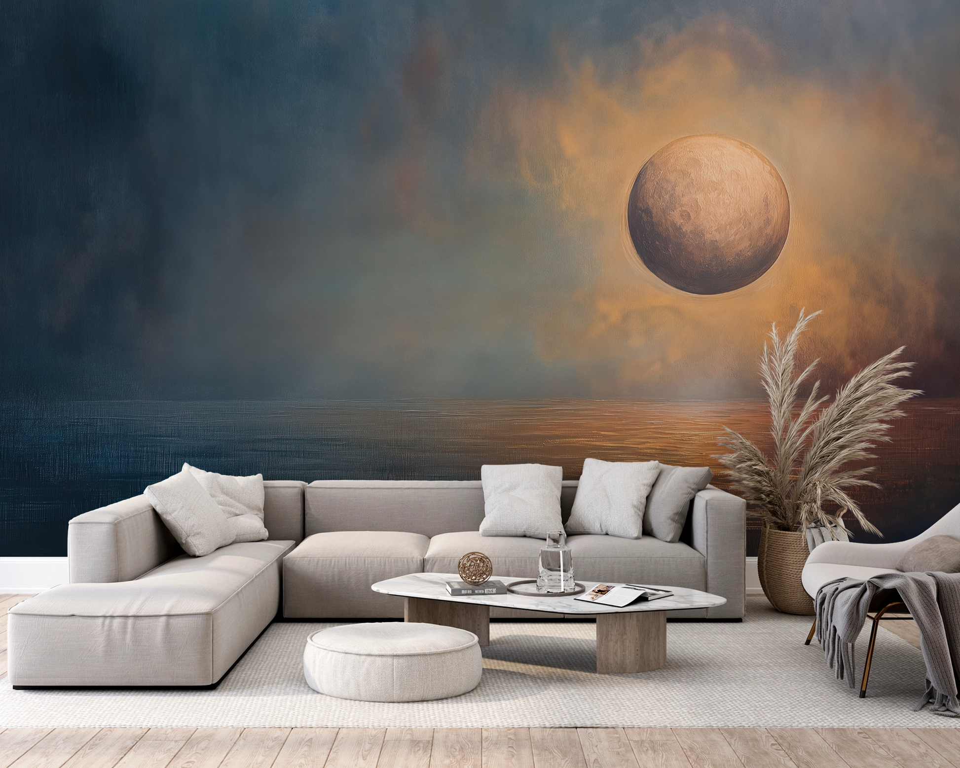 A mysterious moon floats as if suspended above the water's surface, surrounded by a gentle shimmer of light and darkness. This striking wall design combines the depth of a nighttime ocean with the dreamy magic of the sky. Ideal for spaces that radiate tranquility, mystery, and a meditative atmosphere—be it in the bedroom, living room, or a creative retreat.