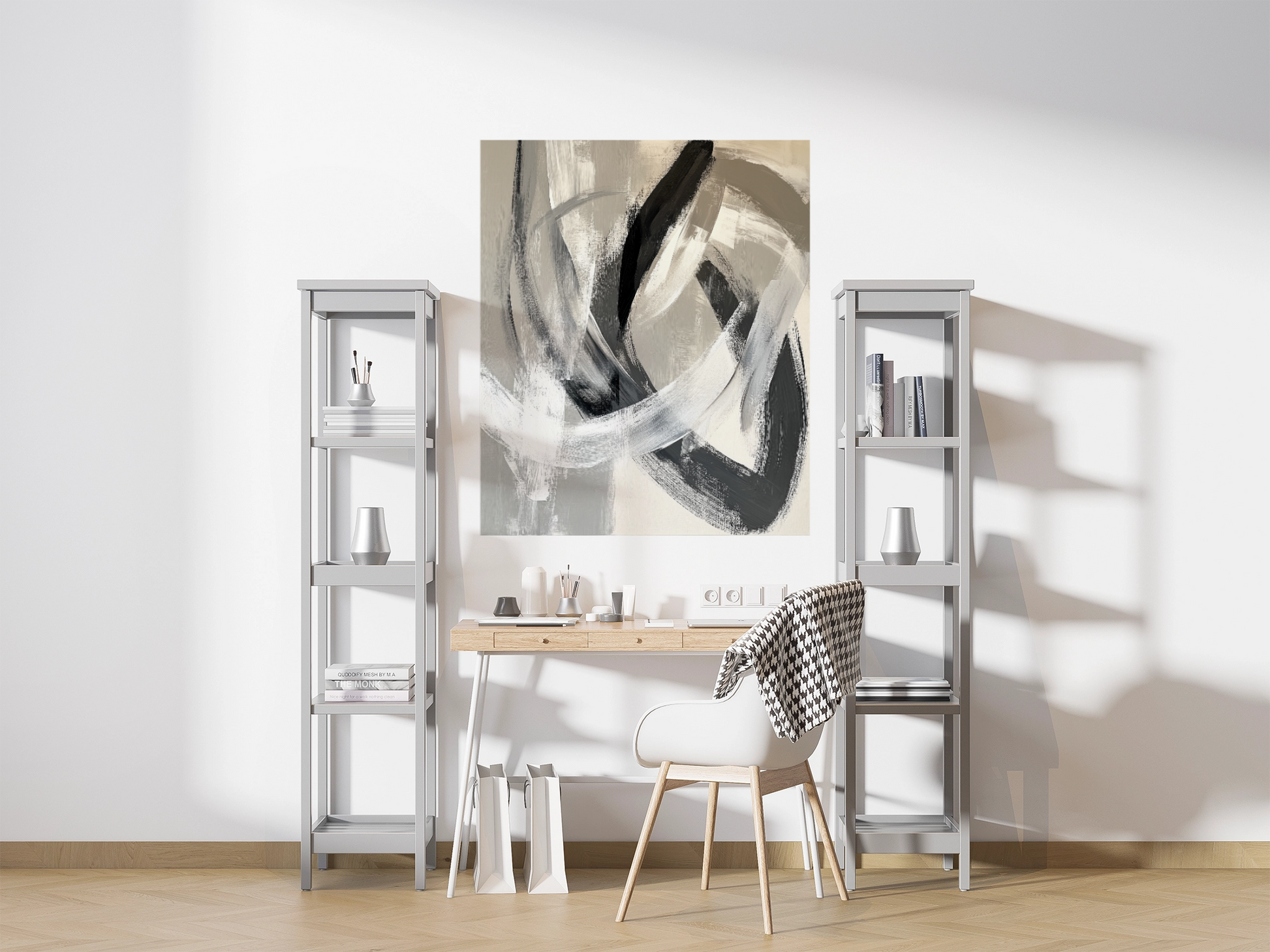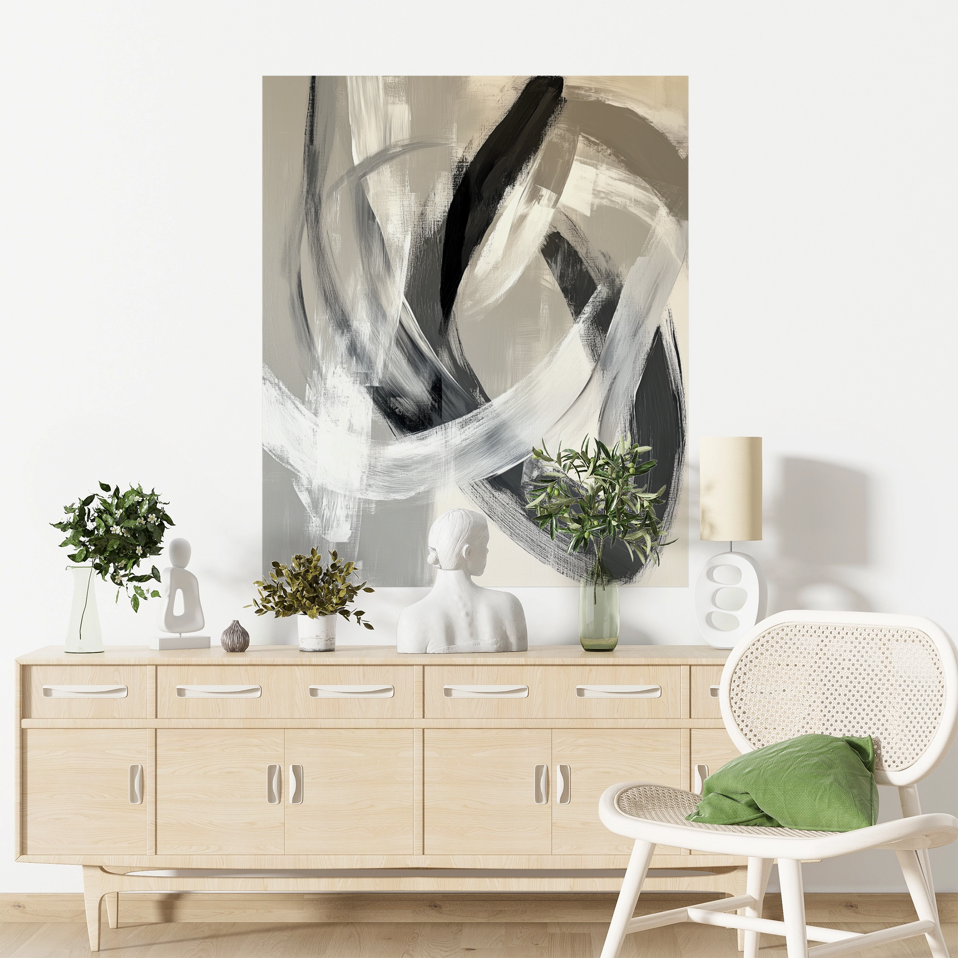 This abstract design plays with soft, organically flowing forms in stone and sand tones. Gentle transitions between light and shadow create a subtle sense of depth, almost like gently undulating layers of rock. The surface resembles finely polished natural stone – modern, yet with a natural warmth. Perfect as a stylish digital wallpaper for living rooms, hotel suites, or spa areas, Stone Flow brings a calm, mineral elegance to any wall – harmonious, timeless, and high-quality.