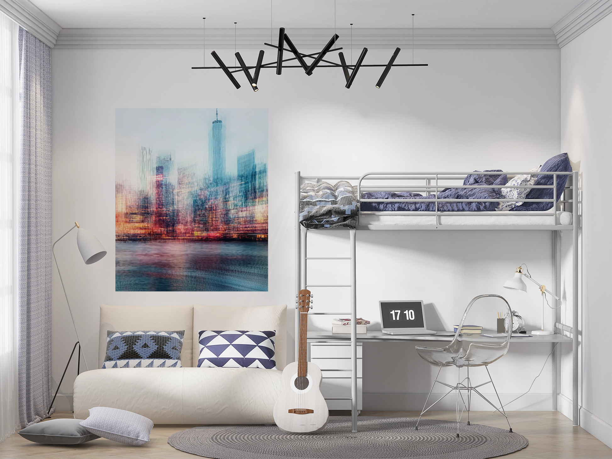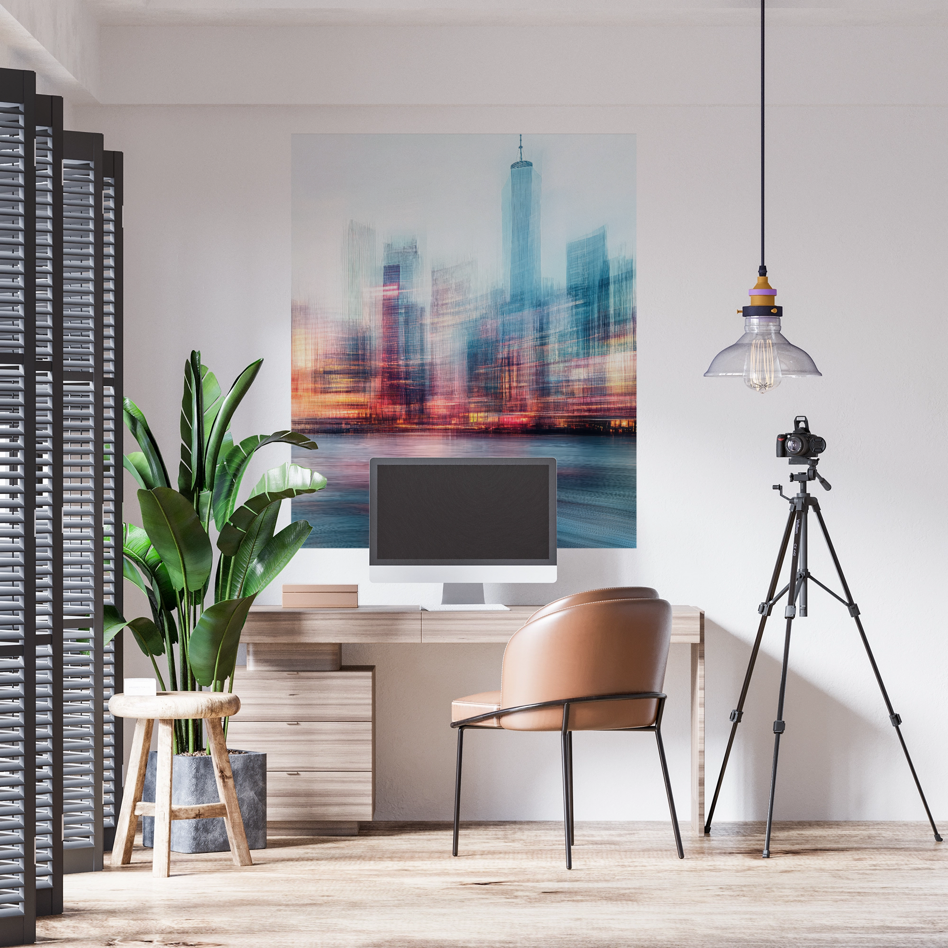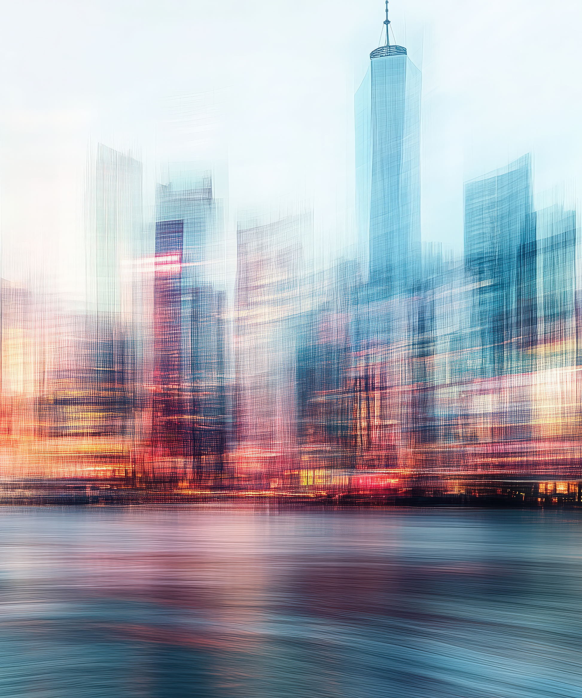 This digital wallpaper design captures the pulsating heart of a metropolis in a fascinating interplay of light, movement, and texture. The urban skyline appears to blur into rhythmic traces of color—as if in constant motion, like a visual breath of the metropolis. Between luminous reflections on the water and flowing architectural contours, a modern, almost poetic impression of urban dynamism emerges. Urban Flow is more than a cityscape—it is an emotional snapshot, abstract yet familiar. Ideal for modern living spaces, creative workspaces, or stylish hotel lobbies where architecture and art merge.