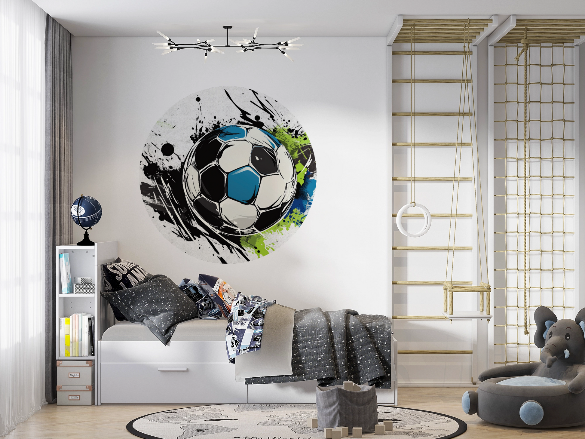 Urban Soccer Splash is a digital wallpaper in DOTS format that combines the energy of soccer with urban design. Its focal point is an iconic soccer ball, dynamically staged with bold brushstrokes, splashes of blue, green, and black, and abstract movement – inspired by street art. The textured white background brings lightness and modern contrast to the room. This wall design is ideal for teen rooms, hobby rooms, gyms, or creative spaces where sport, power, and trends collide. The wallpaper acts as an urban statement – loud, powerful, and individual.