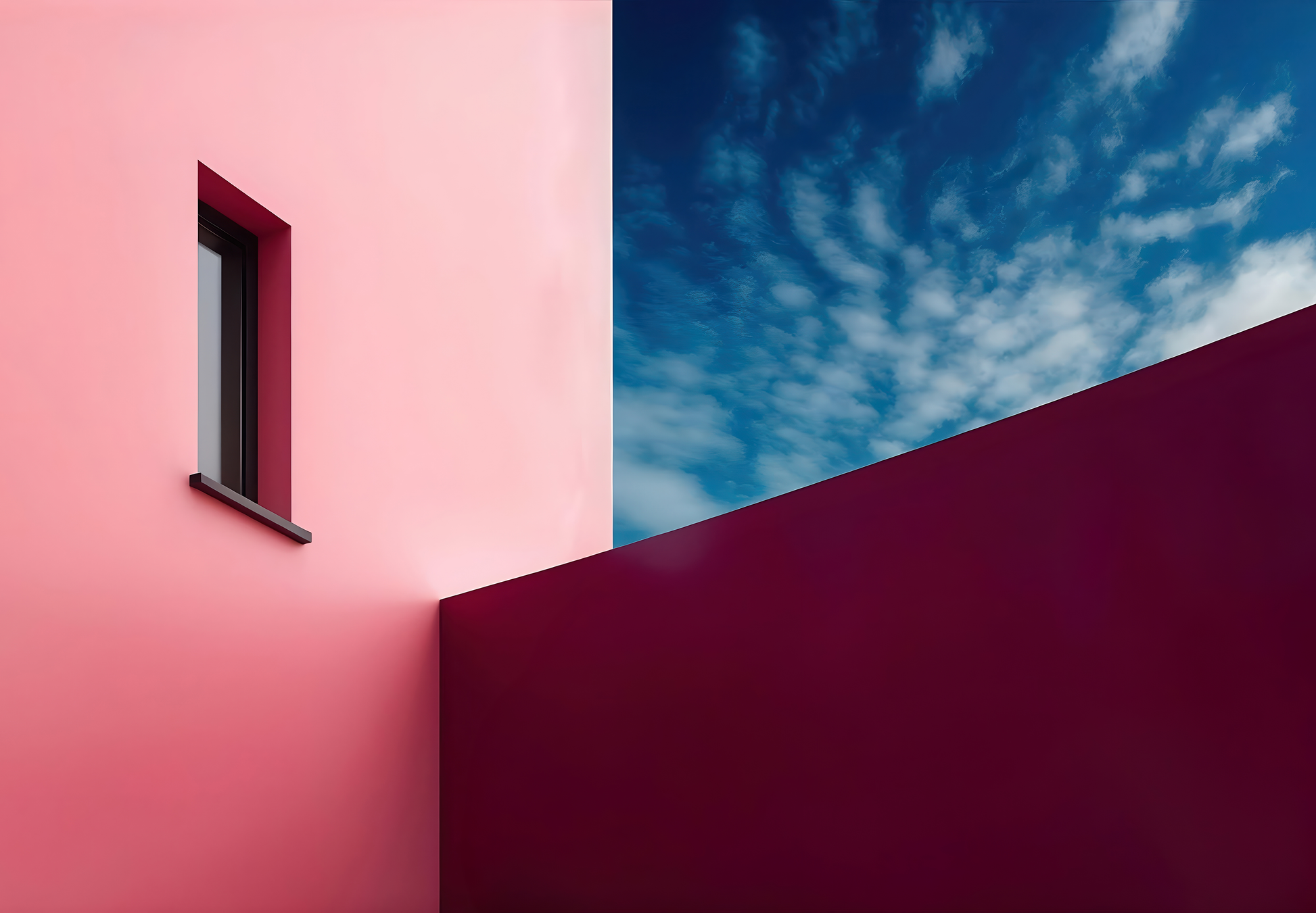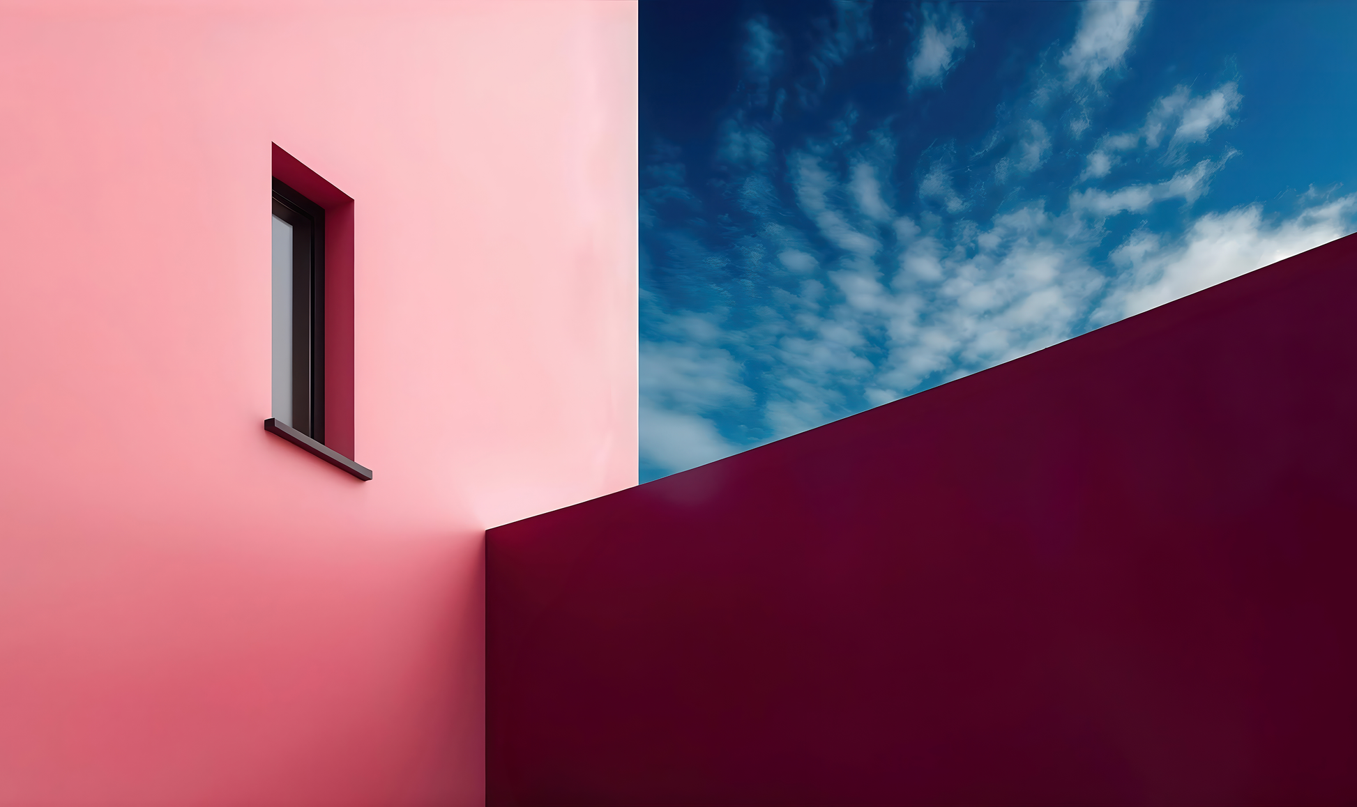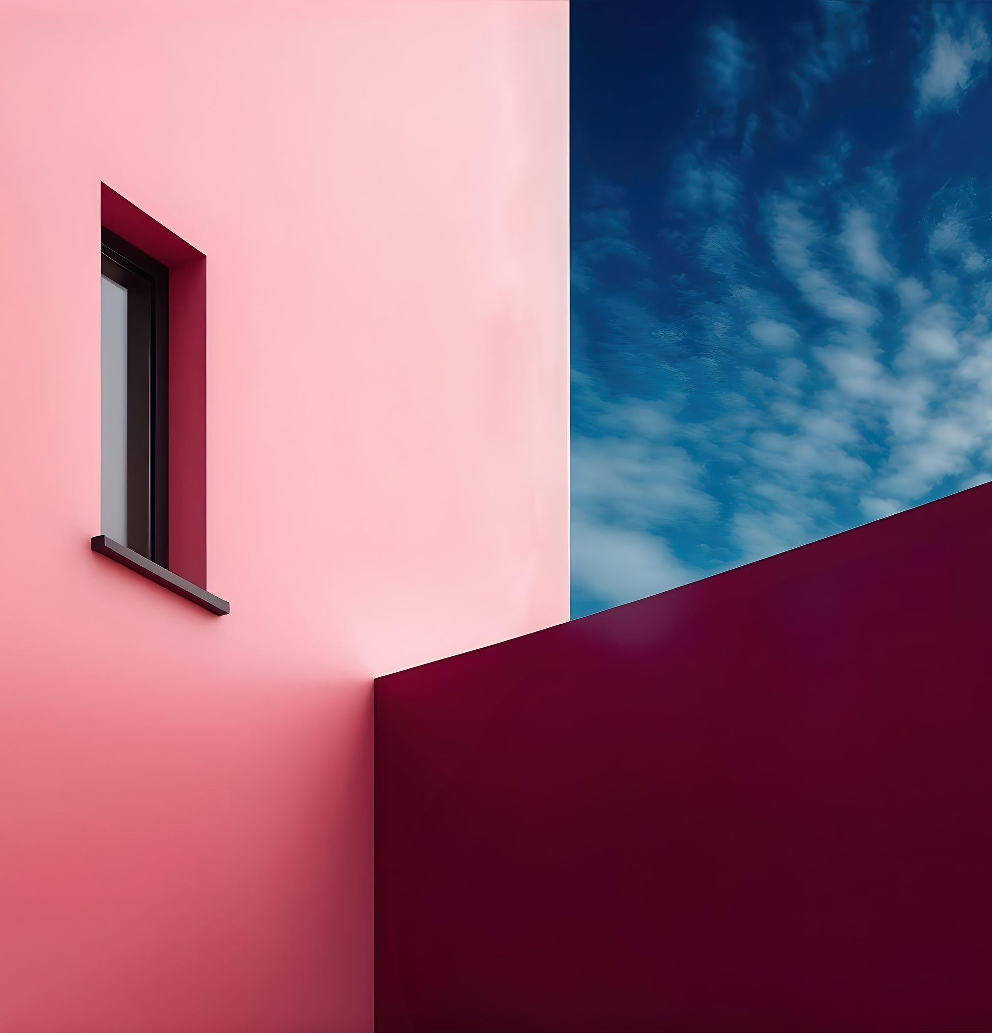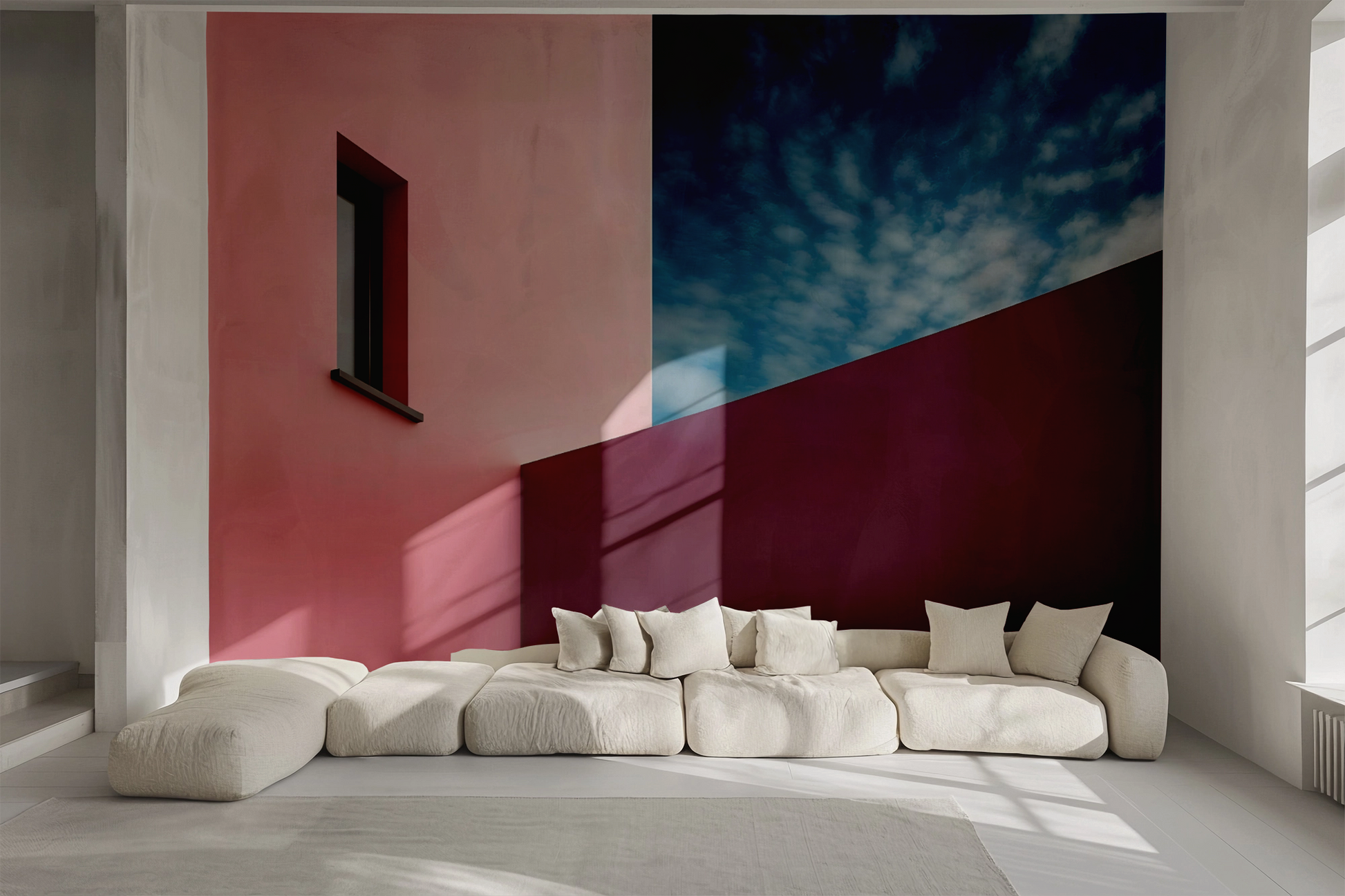 "Urban Light Play" is a modern digital wallpaper with an artistic architectural aesthetic. The motif plays with strong contrasts and clean lines – an interplay of light and form that structures and visually expands the space. The combination of velvety burgundy, soft rose, and a tense sky creates a dense, almost cinematic atmosphere. Ideal for interiors that seek to unite clear forms and stylish colors – whether an urban loft, minimalist living concept, or modern hotel lobby. This mural acts as a design statement and is particularly visually appealing when combined with concrete, metal, or dark wood.