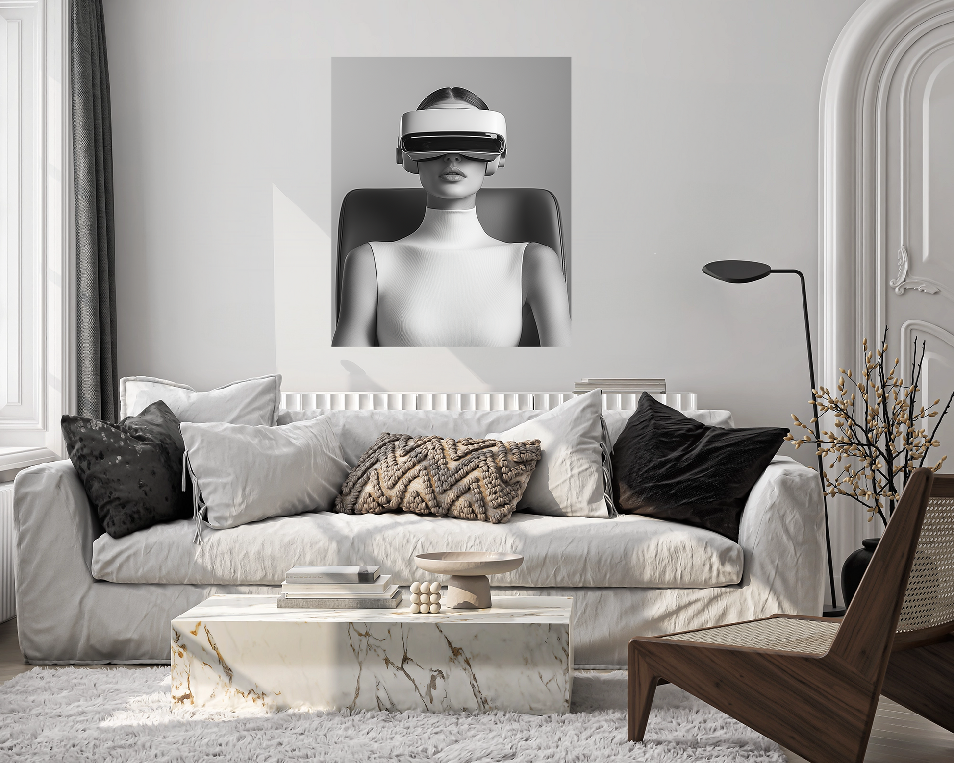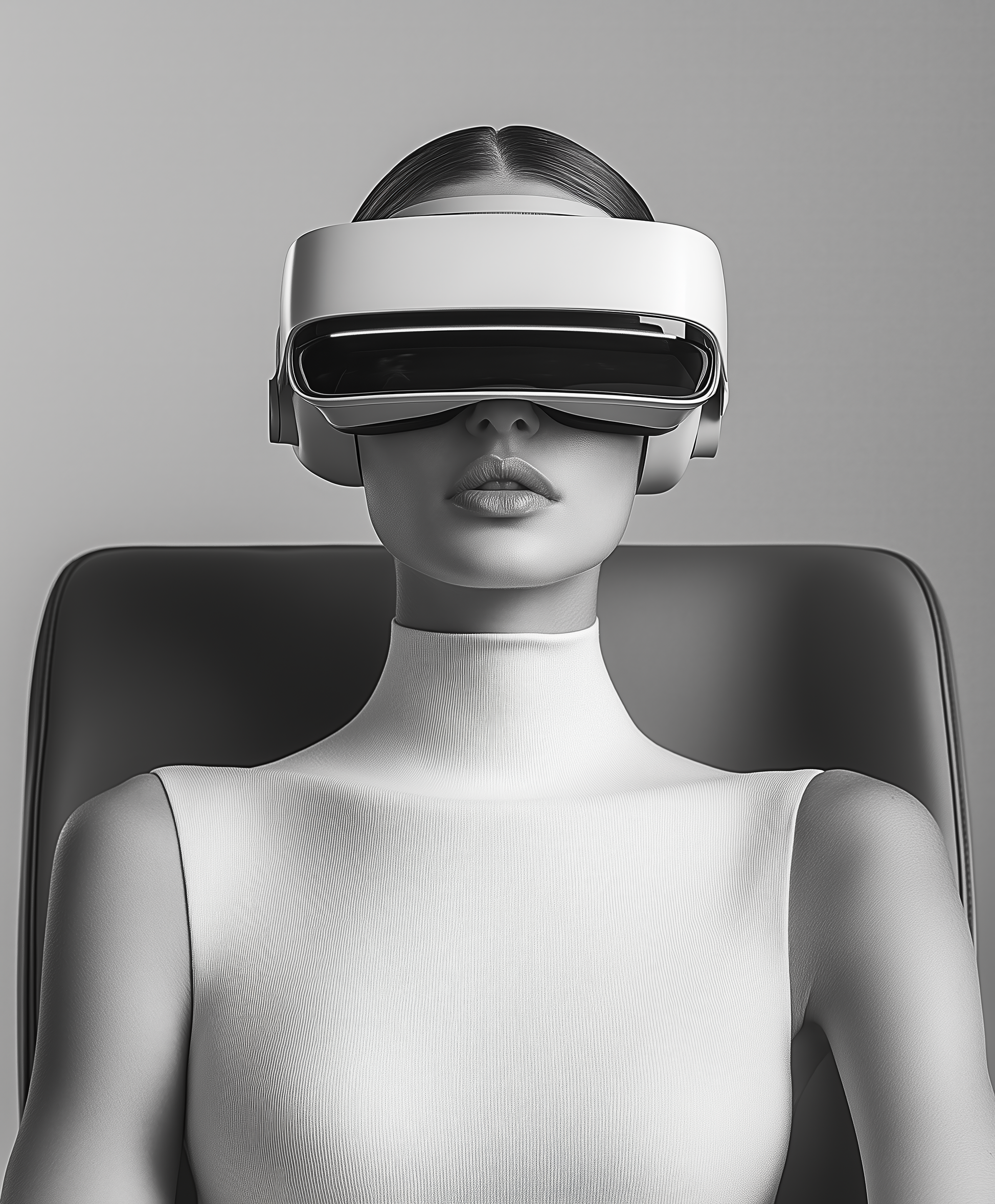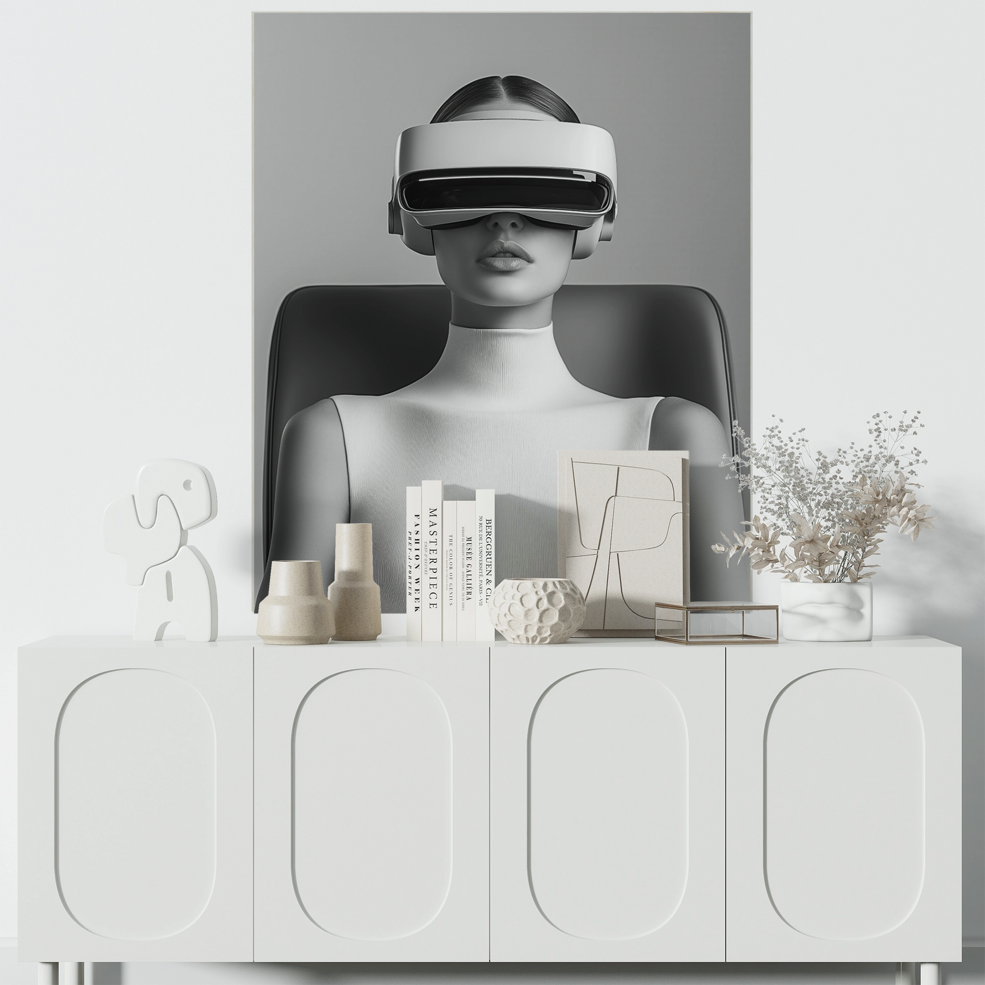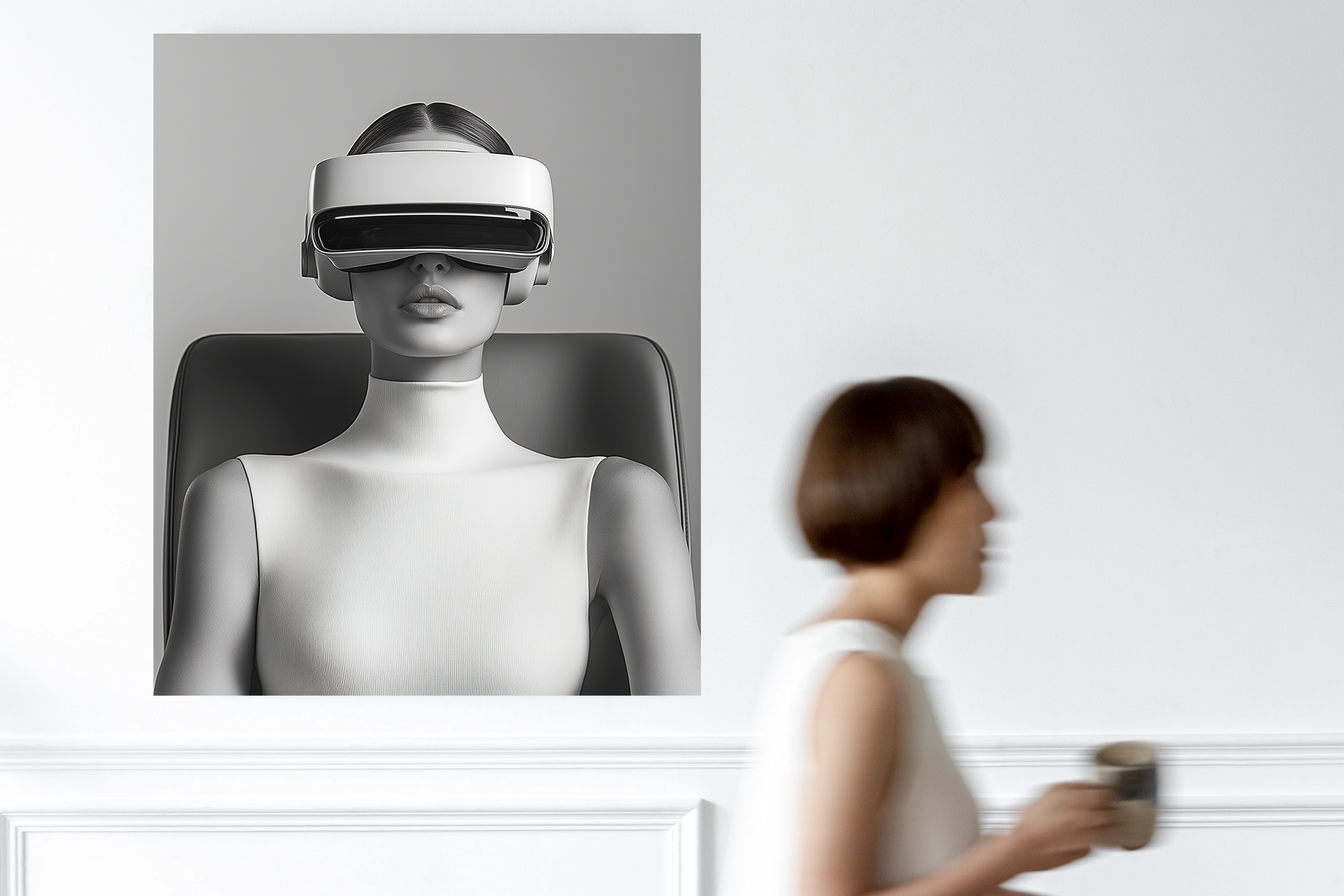 This extraordinary digital wallpaper combines futuristic design with minimalist elegance – a real eye-catcher for modern interiors. The depiction of a stylized woman wearing a VR headset appears like a silent work of art from another dimension: cool, powerful, visionary. The monochrome color spectrum with finely nuanced shades of gray gives the wallpaper a sophisticated, almost sculptural effect. The strong contrast between technology and aesthetics creates an iconic wall motif – reduced yet full of expression. This wallpaper is perfectly suited to modern work or conference rooms, studios, and showrooms, but also as a stylistic break in private living spaces. Especially on portrait walls, it appears like an art statement – clear, confident, and future-oriented.