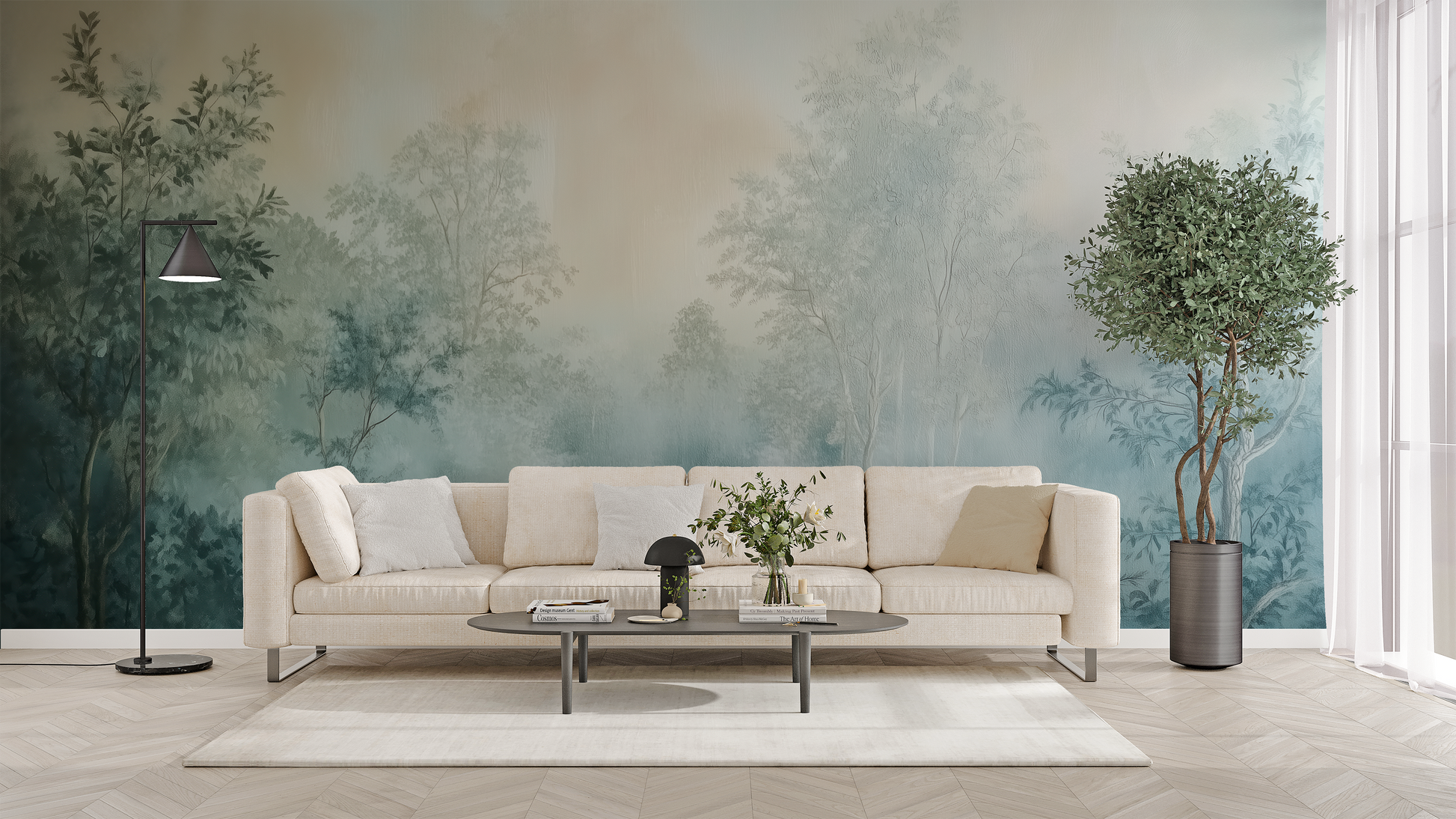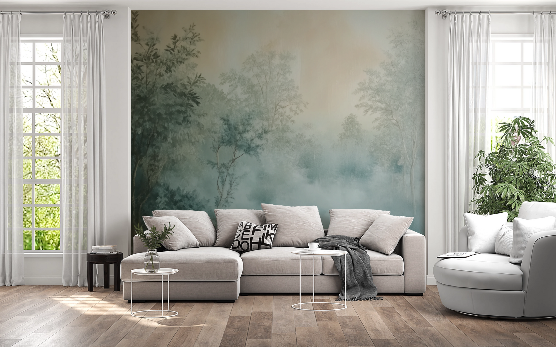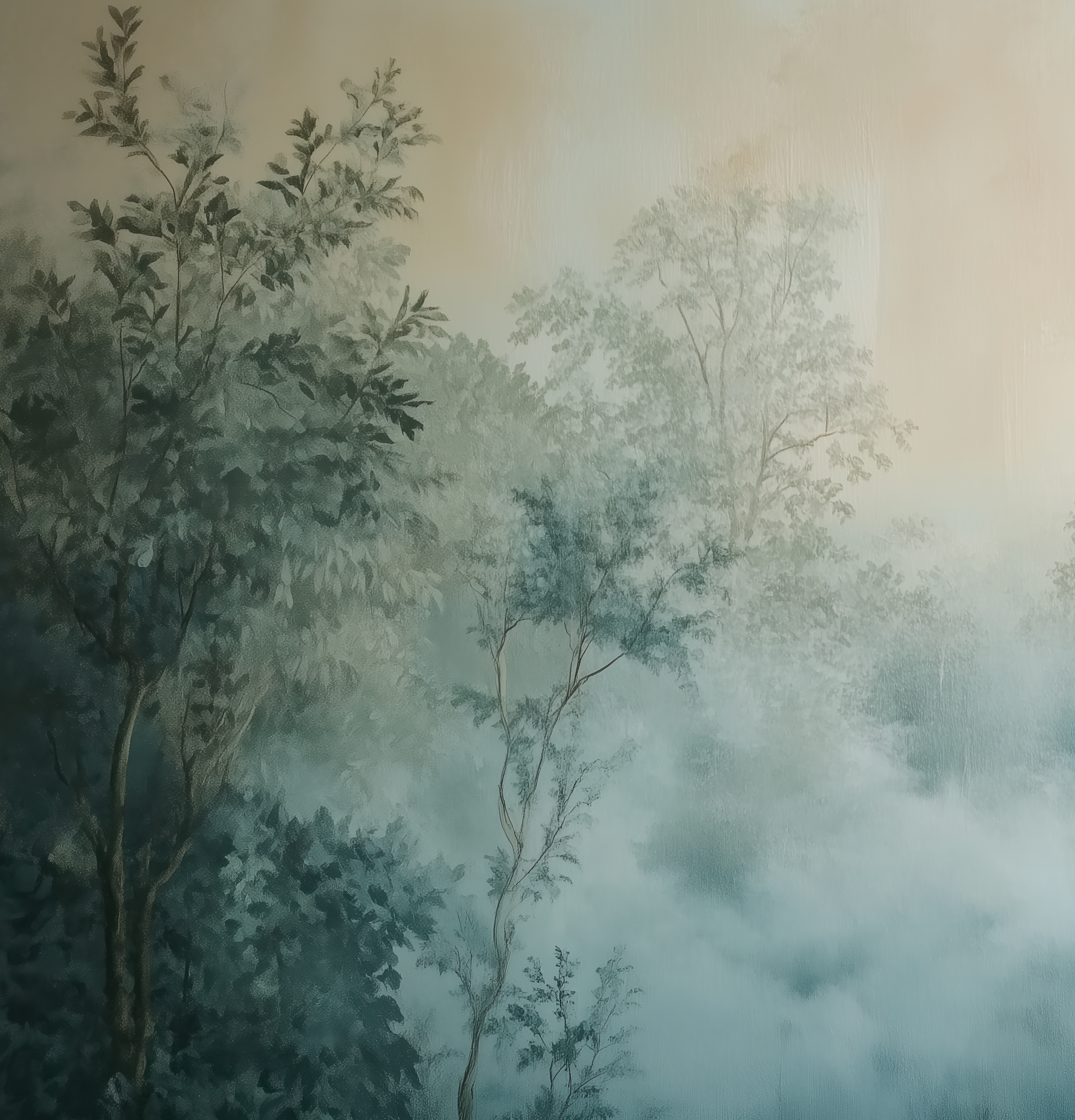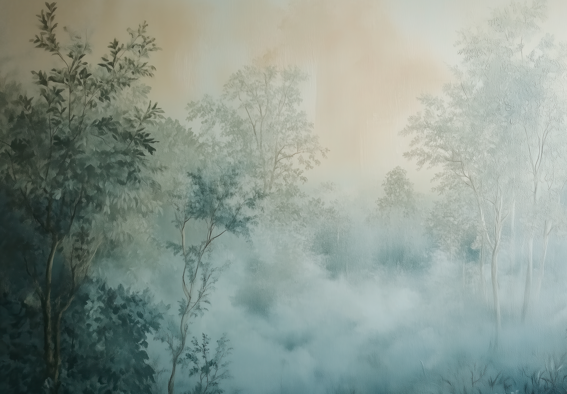 This hand-painted forest landscape exudes a tranquil, almost meditative atmosphere. Delicate green tones blend with soft veils of mist, while a gentle light unfolds in the background – as if the morning were just awakening. The delicate silhouettes of the trees appear almost weightless, creating depth without being intrusive. A mural that transforms rooms into tranquil retreats – ideal for bedrooms, living rooms, lounge areas, or places of creativity. It brings a connection to nature, elegance, and a profound sense of calm to any room.