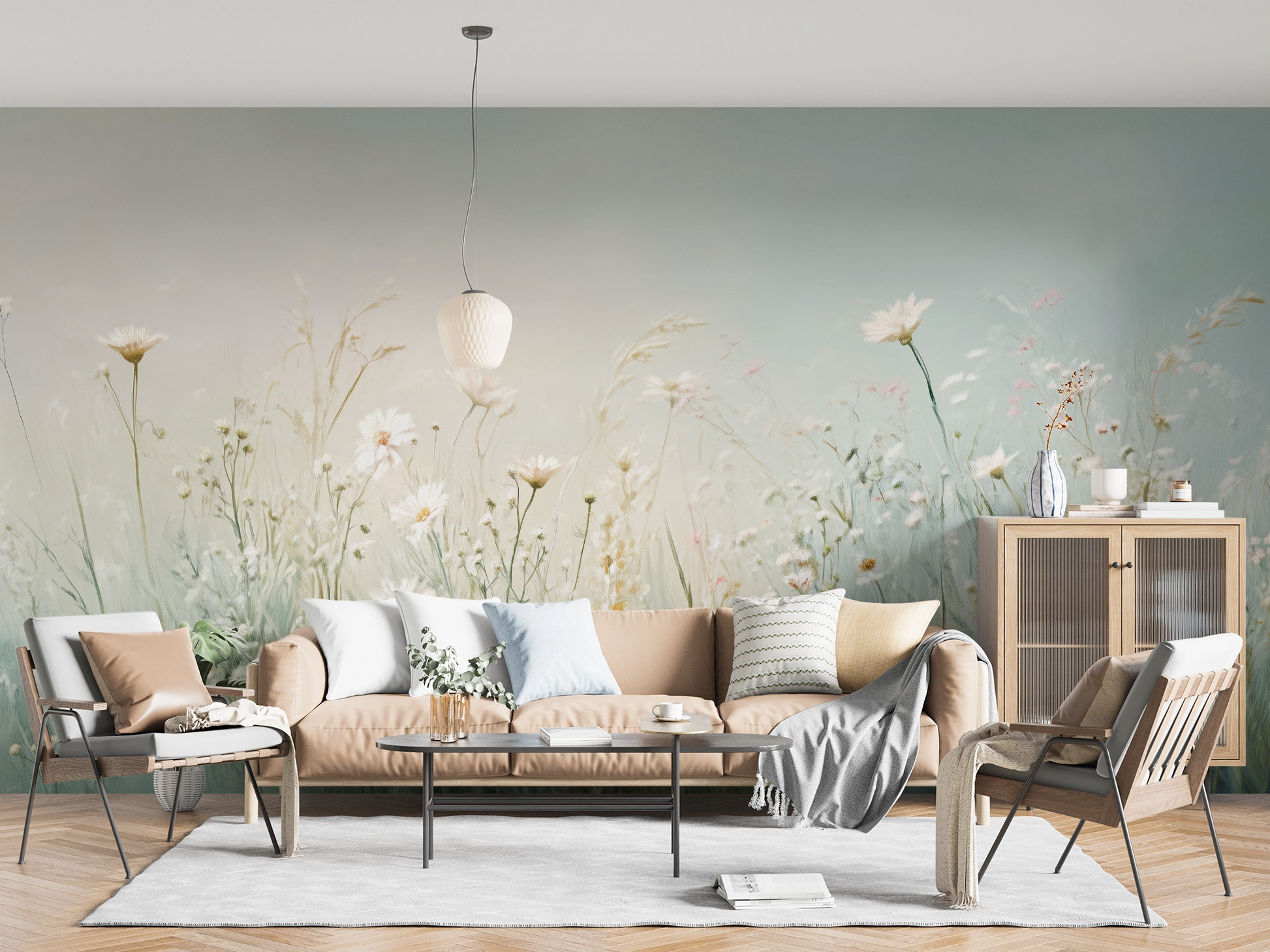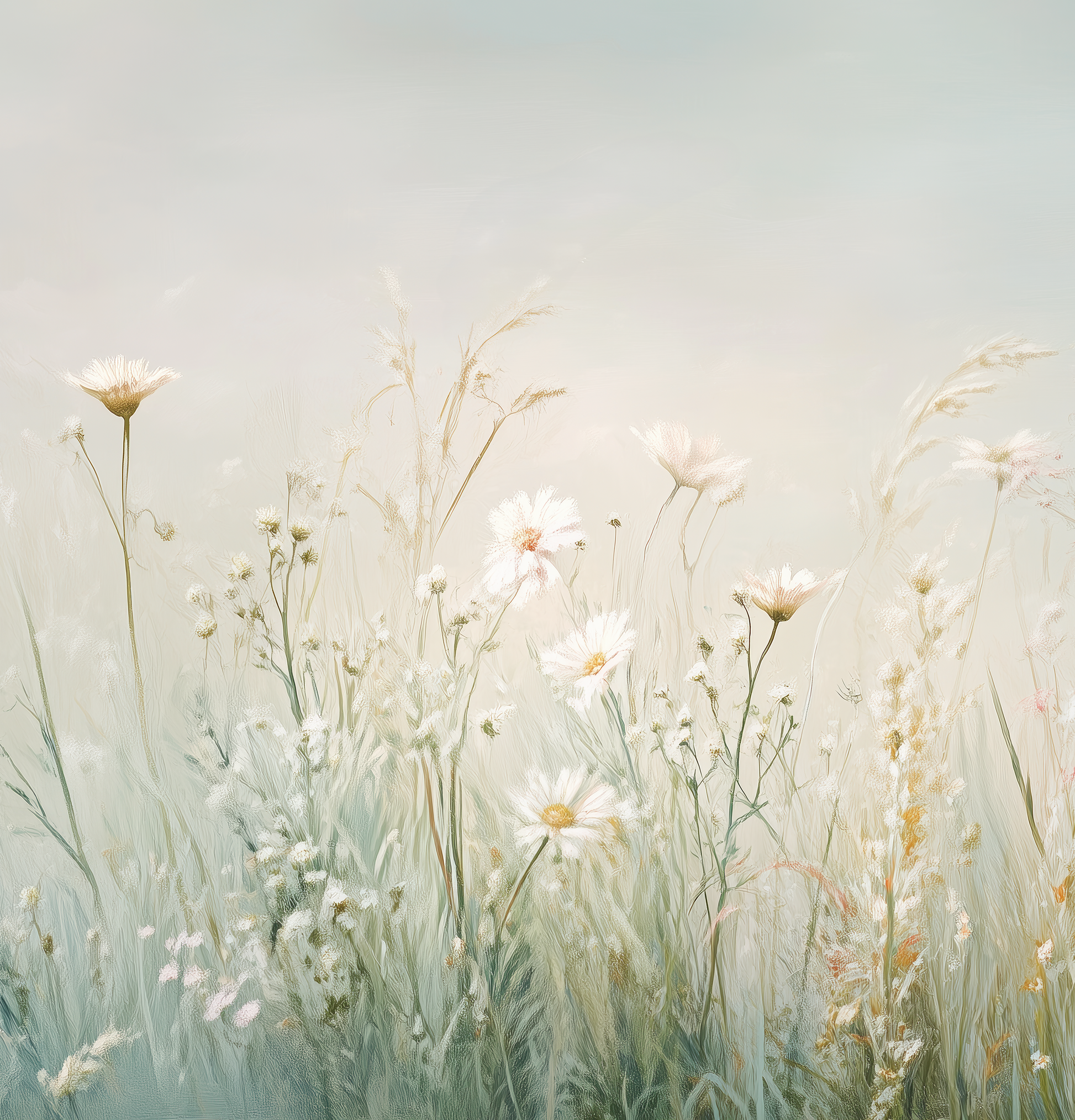 "Meadow Dream" is a poetic homage to the quiet beauty of nature. The composition of delicate blossoms, fine grasses, and natural tones resembles a painted still life of a sunny summer day—light, peaceful, and full of life. The floral digital wallpaper blends seamlessly into modern, nature-inspired interiors. It's a perfect match for country-style decor, romantic interiors, or as a gentle contrast in clean, minimalist spaces. The subtle color scheme and delicate shapes bring calm and freshness to any wall—without appearing kitschy. Ideal in combination with wood, linen, ceramic, or natural stone—for a homey ambiance with a natural flair.