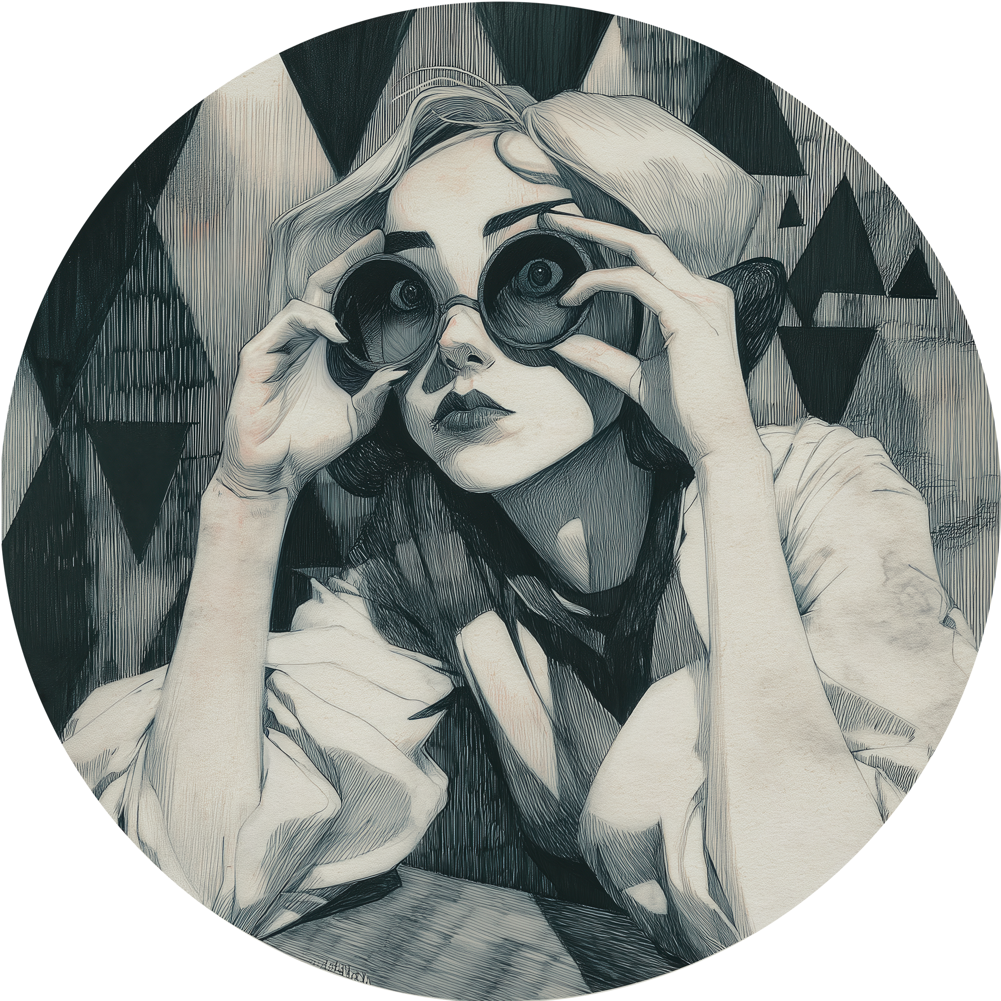 Das Motiv zeigt eine stilisierte Frau, die durch runde Gläser blickt – ein grafisches Sinnbild für Fokus, Wahrnehmung und bewusste Perspektive. Feine Linien und präzise Schraffuren verleihen der Illustration Tiefe, während geometrische Formen im Hintergrund eine moderne, abstrakte Struktur schaffen.