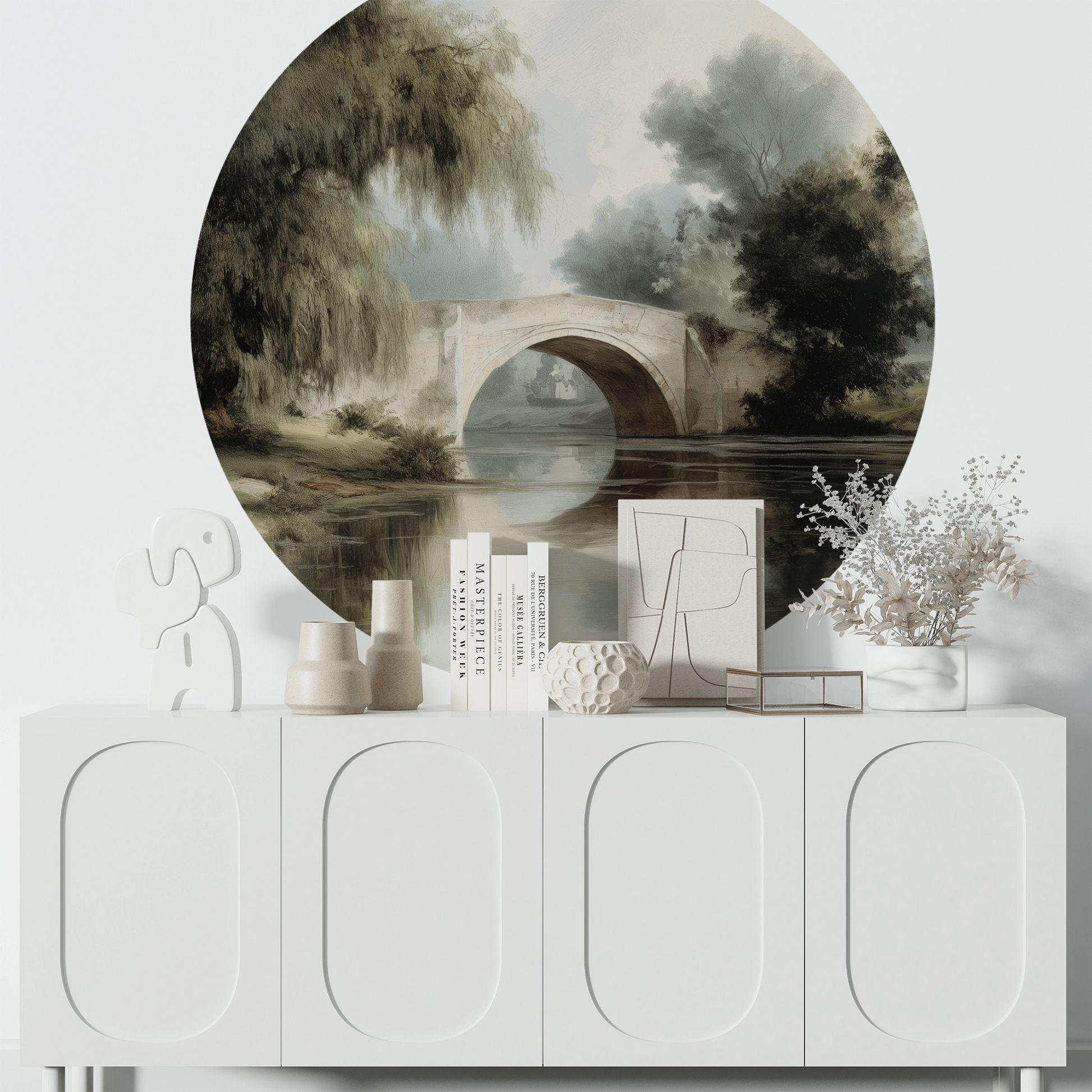 Das runde Landschaftsmotiv mit einer harmonisch eingebetteten Steinbrücke und sanften Naturtönen schafft eine entspannende Atmosphäre und wirkt wie ein Fenster in eine stille, friedliche Welt.