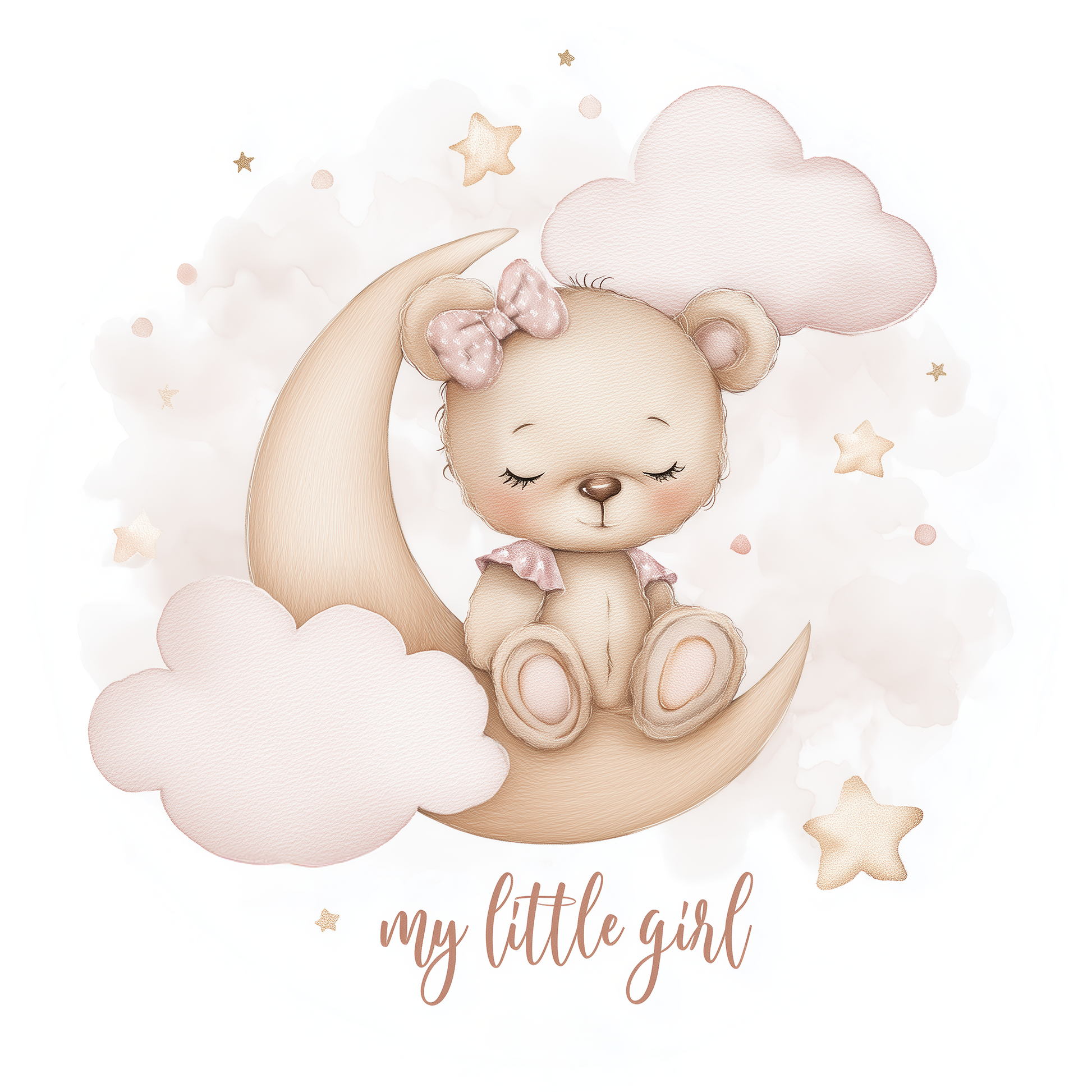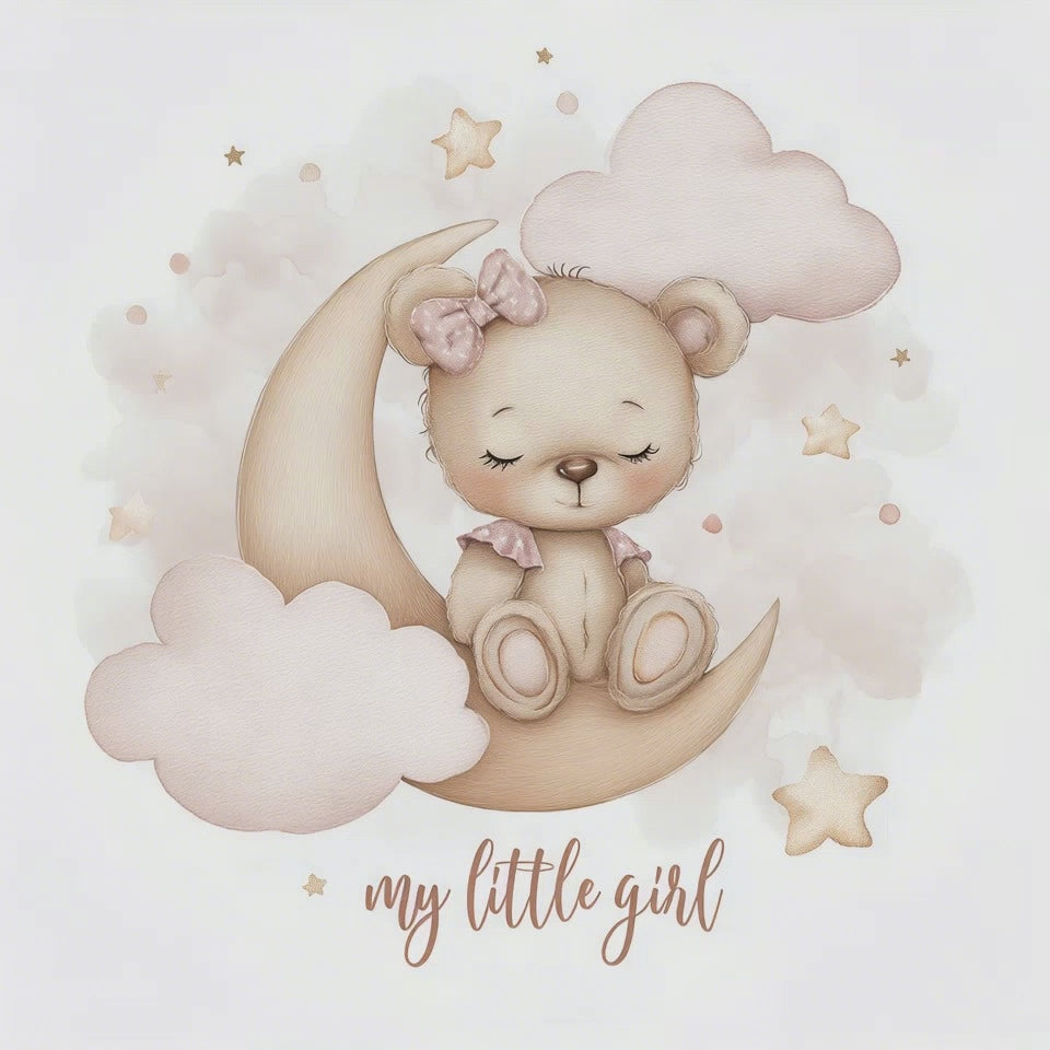 Ein zartes Design voller Geborgenheit: Der süße Bären-Wandsticker „My Little Girl“ zeigt ein schlafendes Bärenmädchen auf einer Mondsichel, umgeben von rosa Wolken und goldenen Sternen.