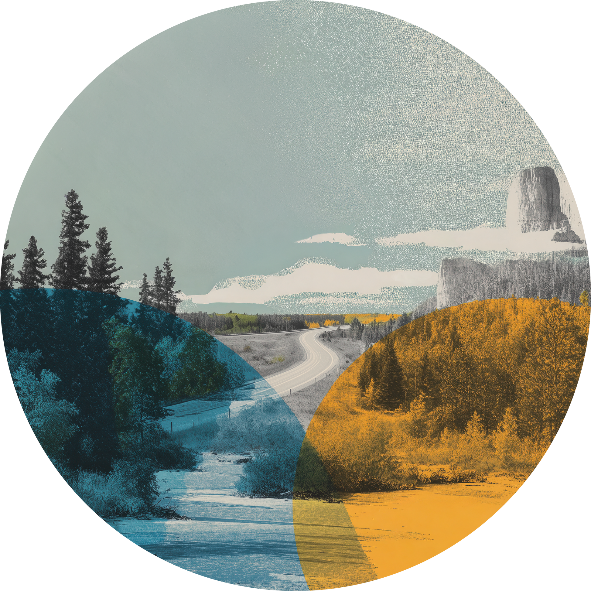 Das runde Landschaftsmotiv mit sanften Farbflächen und harmonischen Naturtönen schafft eine stilvolle Atmosphäre und wirkt wie ein modernes Kunstobjekt an deiner Wand.